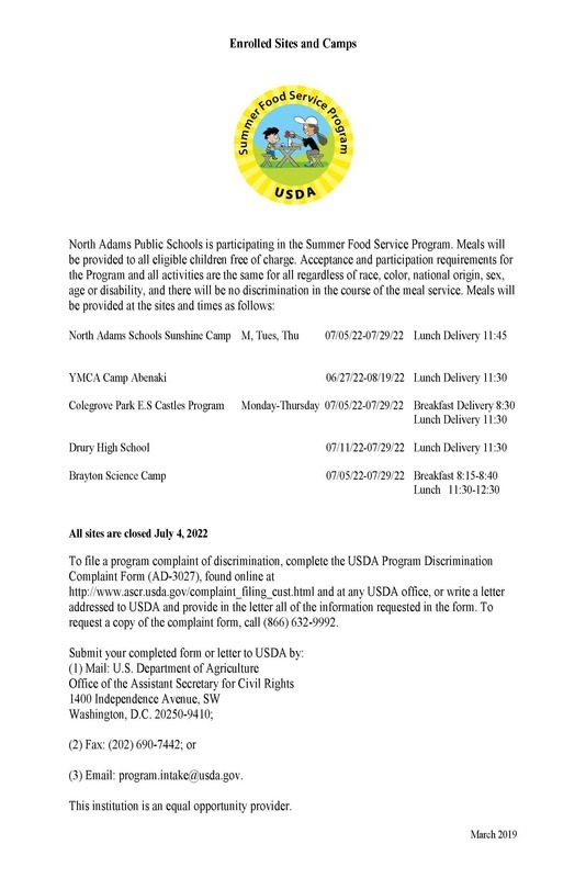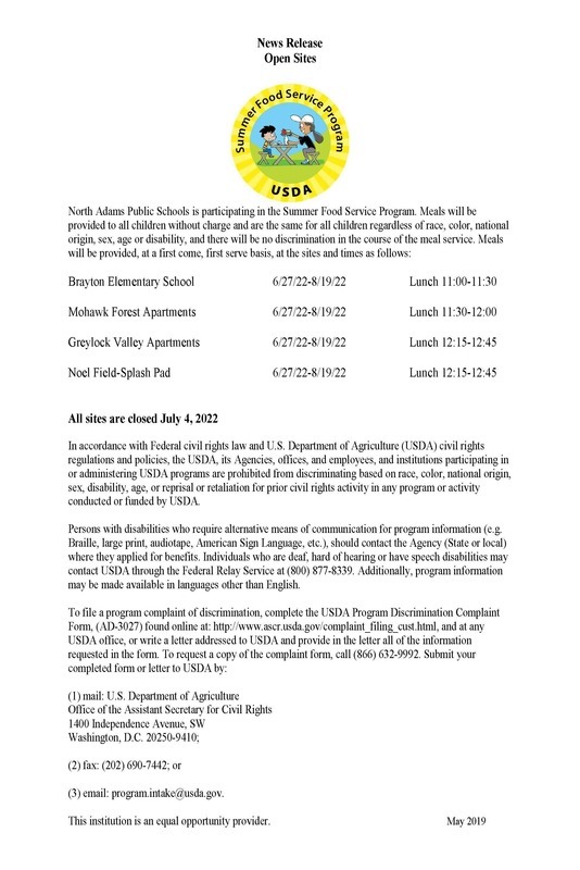 Open Sites for Summer Meals (open to all North Adams residents 18 and under)
