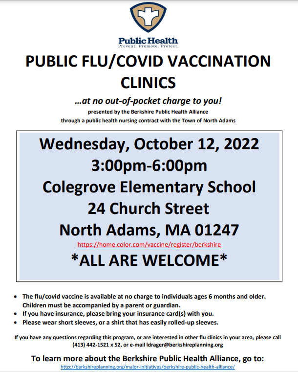 A COVID/Flu Vaccine Clinic has been jointly organized by the Berkshire Public Health Alliance and the North Adams School District. The clinics will take place on  Wednesday, October 12th from 3:00-6:00 pm at Colegrove Park Elementary School. All are welcome.  Registration can be completed at https://home.color.com/vaccine/register/berkshire