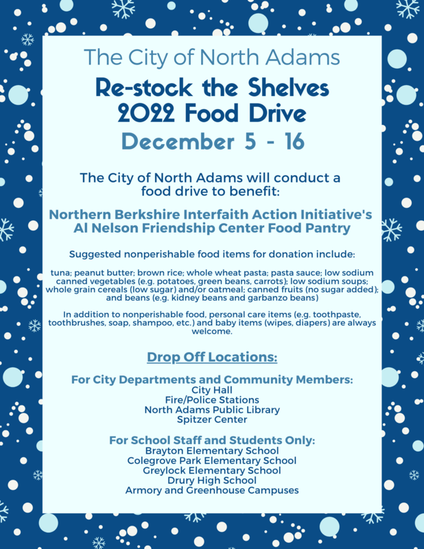 NORTH ADAMS, MA (November 18, 2022) – The City of North Adams is holding their annual food drive from Monday, December 5 through Friday, December 16, 2022. This year’s drive will seek to re-stock the shelves of the Northern Berkshire Interfaith Action Initiative’s Al Nelson Friendship Center Food Pantry, located at 43 Eagle Street in North Adams.